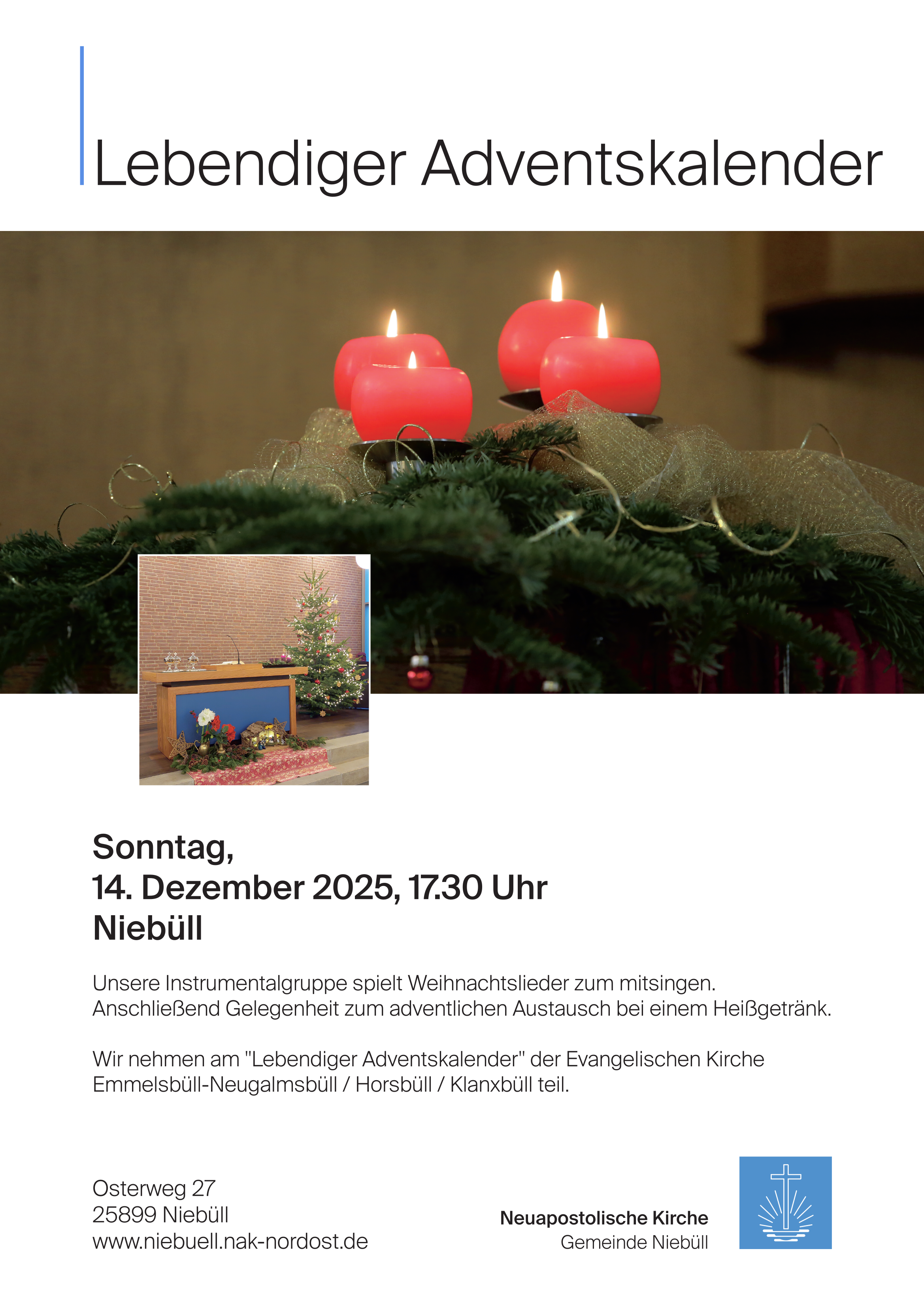 Anschließend Gelegenheit zum adventlichen Austausch bei einem Heißgetränk. Wir nehmen am "Lebendiger Adventskalender" der Evangelischen Kirche Emmelsbüll-Neugalmbüll / Horsbüll / Klanxbüll teil.
